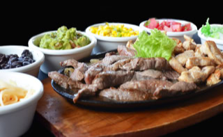 Plato fondo: Fajita lomo-pollo acompañada de tortillas y salsas de queso, guacamole, tomates, lechuga y choclo.